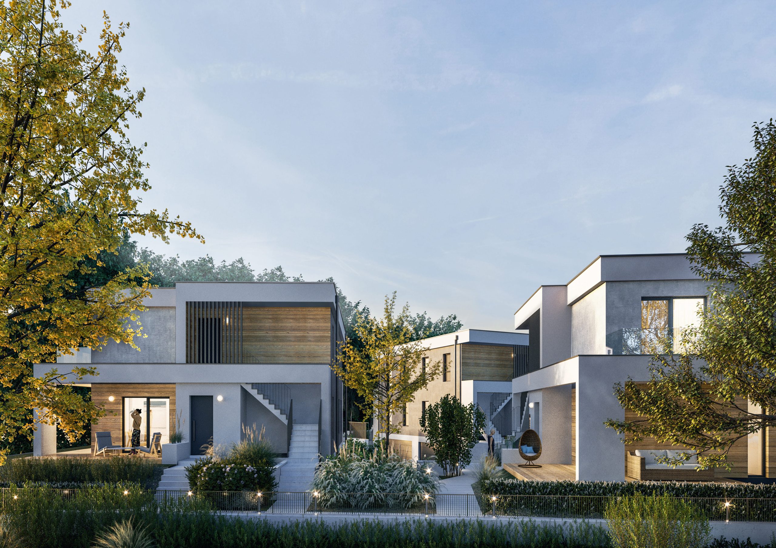 Projekt obejmuje cztery nowoczesne budynki o niskiej, harmonijnej zabudowie, w których zaplanowano po cztery mieszkania. Lokale na parterze zostały uzupełnione o prywatne ogródki, a mieszkania na piętrze o balkony, podkreślając komfortowy charakter inwestycji.